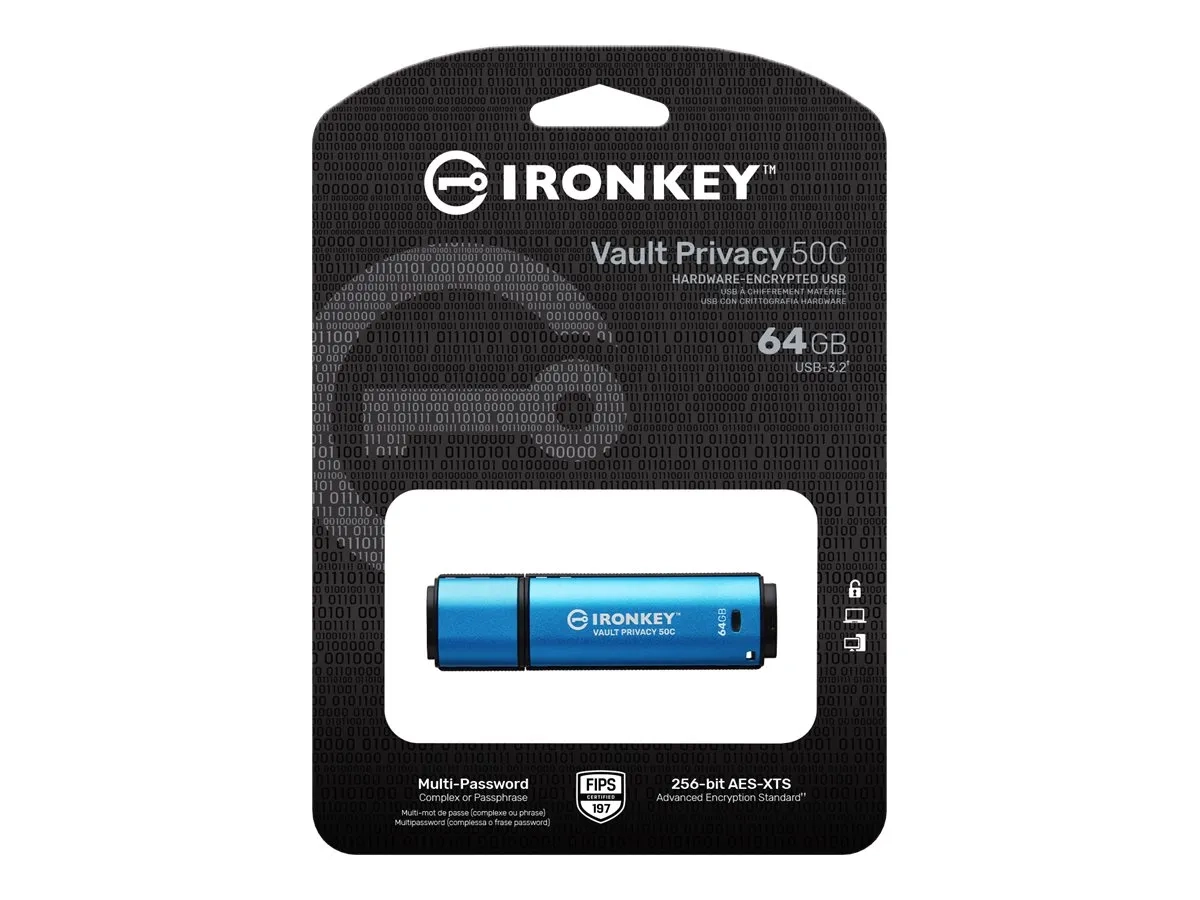 Les clés USB de la gamme Kingston IronKey Vault Privacy 50 sont des clés USB qui offrent une sécurité de niveau entreprise grâce au chiffrement matériel AES 256 bits certifié FIPS 197 en mode XTS. Elle offre également une protection contre les BadUSB avec un firmware signé numériquement et contre les attaques par force brute visant les mots de passe. La VP50 a fait l'objet d'un test d'intrusion (Pen Tested) pour une sécurité de niveau entreprise. Parce qu'il s'agit d'un stockage chiffré sous le contrôle physique de l'utilisateur, la gamme VP50 est idéale pour l'utilisation d'Internet et des services Cloud pour protéger les données.