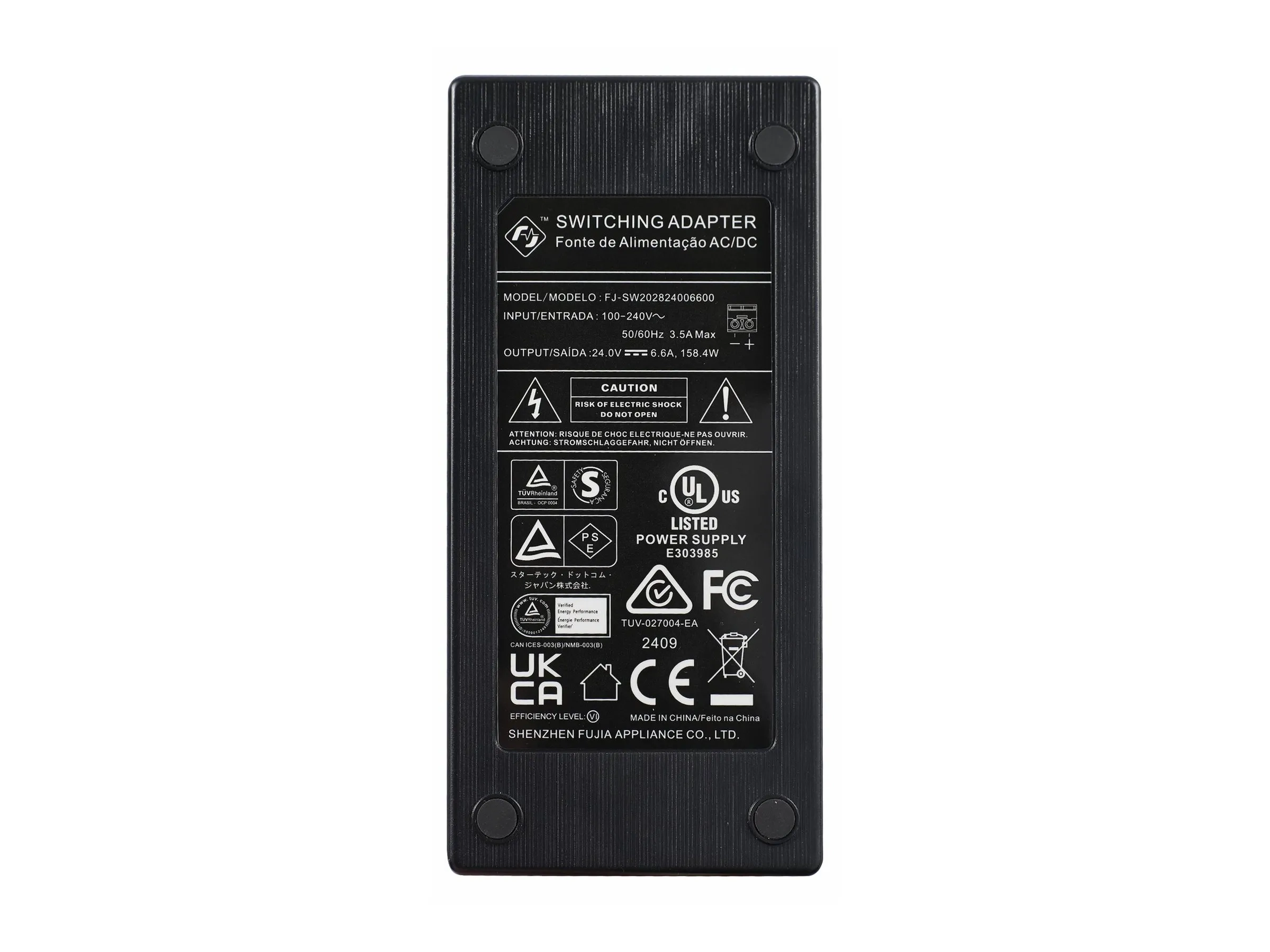L'adaptateur secteur dispose d'une entrée AC auto-commutable de 100-240V avec une sortie DC de 24V/6.6A (158.4W) et un cordon DC de 4 pieds (1,2 m) attaché.