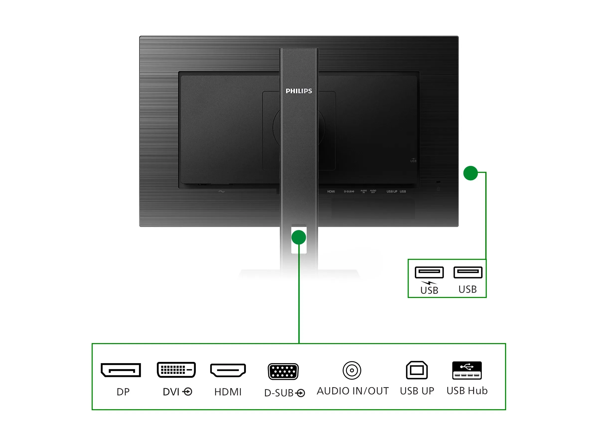 | Interfaces | VGA ¦ DVI-D (HDCP) ¦ DisplayPort (HDCP) ¦ HDMI (HDCP) ¦ Amont USB (Type B) ¦ 3 x aval USB 3.2 ¦ Aval USB 3.2 (charge rapide) ¦ Entrée de ligne audio ¦ Casque |