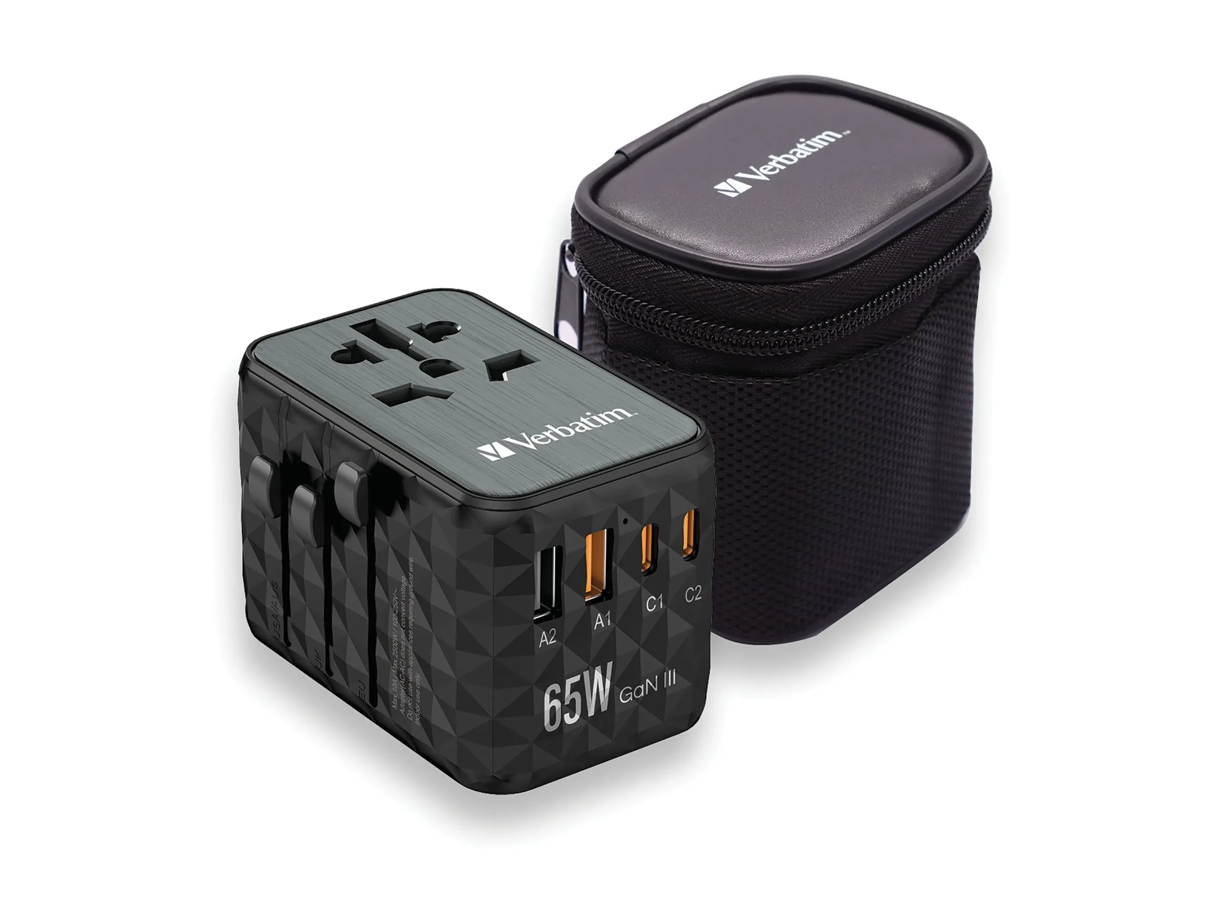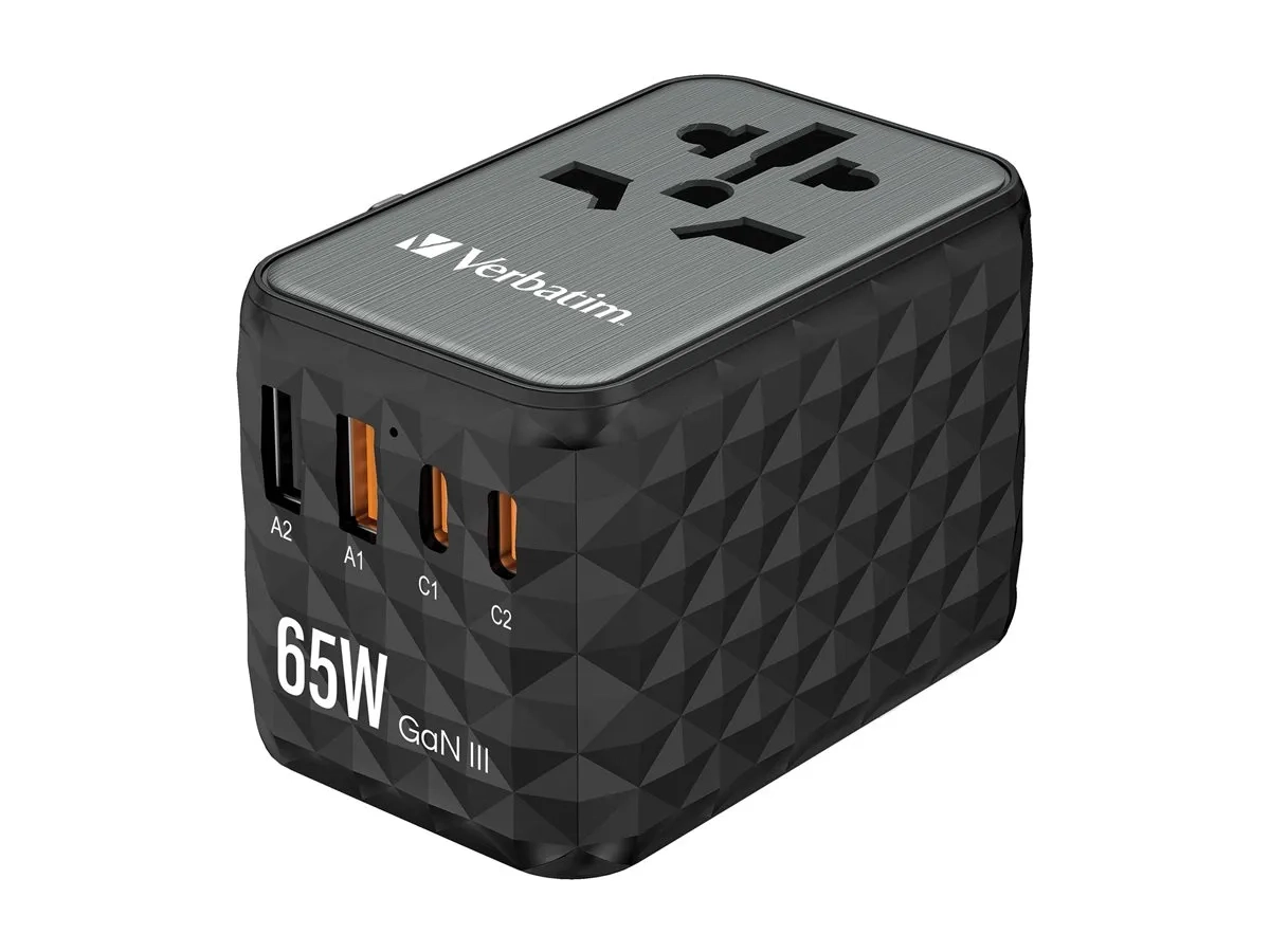 Verbatim UTA-05 - Adaptateur secteur - GaN III, universel - 65 Watt - 5 A - PD 3.0, QC 4.0+, QC 3.0, Fast Charge, Supercharge, Apple Fast Charge, PD/PPS, USB BC 1.2 - 4 connecteurs de sortie (2 x USB-C, 2 x USB) - noir