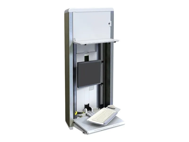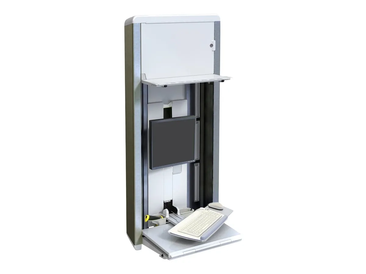 Station de travail sûre, complète et compacte. Idéal pour les chambres dont l'espace est réduit, ce système d'ajustement vertical discret propose un ajustement sans effort de 23 cm et se replie en une unité mince et compacte lorsqu'il n'est pas utilisé. Son mécanisme de verrouillage sans clé permet de protéger les données du patient et d'ainsi respecter les exigences en termes de confidentialité.