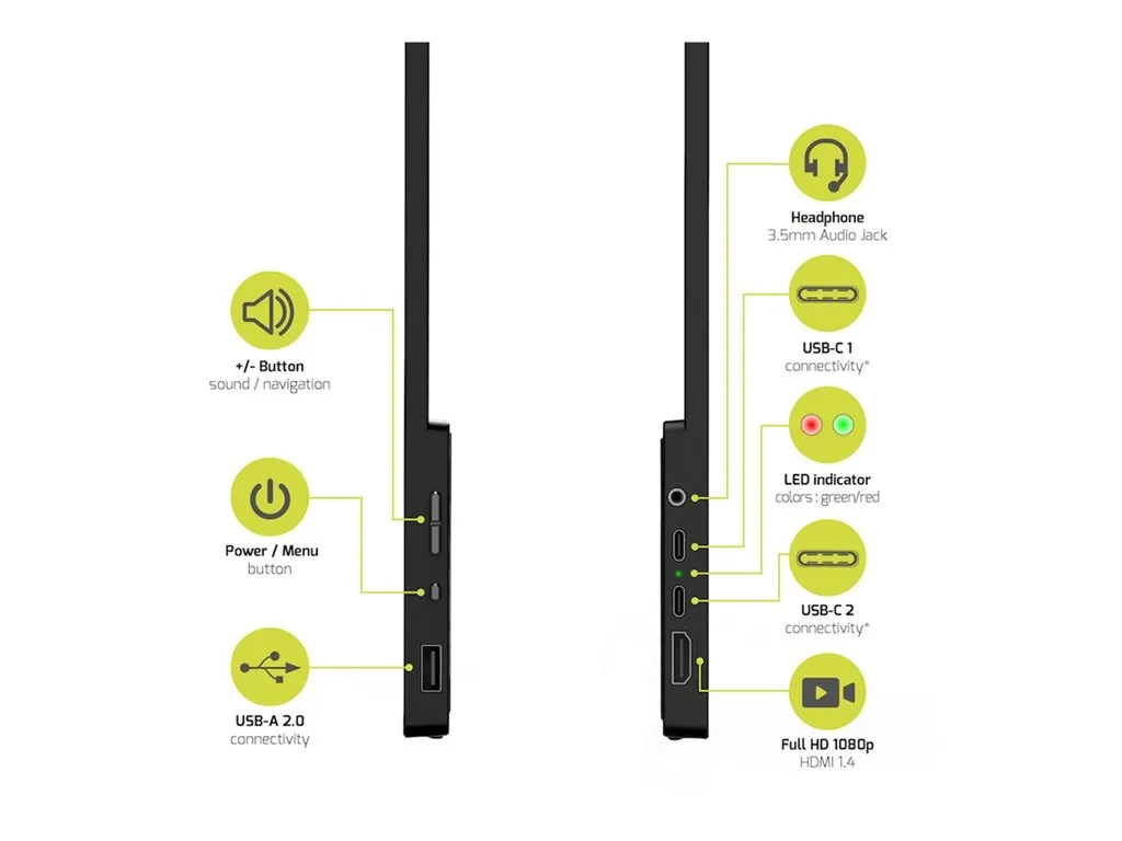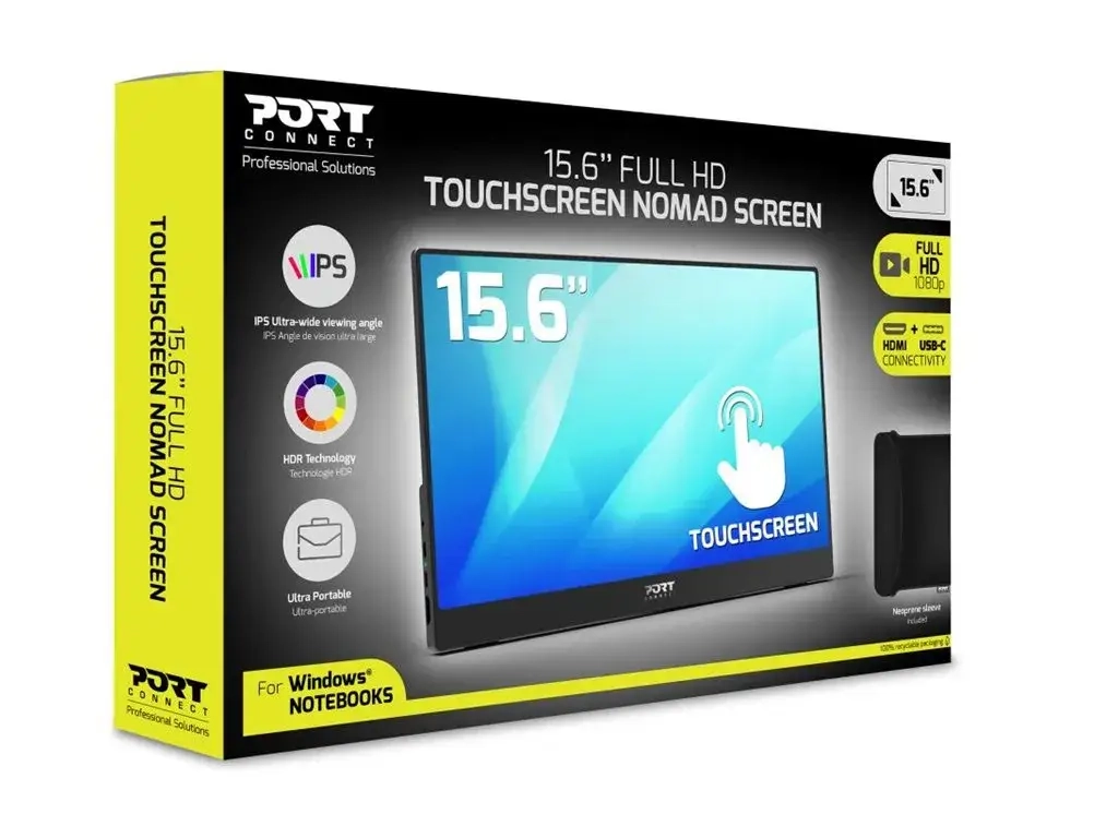 L'écran tactile nomade LCD 15.6" 902101T de PORT Connect a un format ultra-fin et léger, idéal pour les professionnels en déplacement. Il offre une interaction intuitive et réactive grâce à son panneau IPS, garantissant un affichage net et précis en Full HD 1080p. La technologie HDR améliore la qualité visuelle avec des contrastes et des couleurs enrichis. Grâce à l'USB-C Power Delivery fournissant jusqu'à 65 W de puissance, un seul câble suffit pour la connexion via USB-C ou HDMI, avec auto-alimentation depuis l'ordinateur. Facile à installer avec sa configuration Plug & Play, il inclut un port USB-A 2.0, une prise audio 3,5 mm, 2 haut-parleurs intégrés et un support arrière ajustable pour une utilisation optimale.