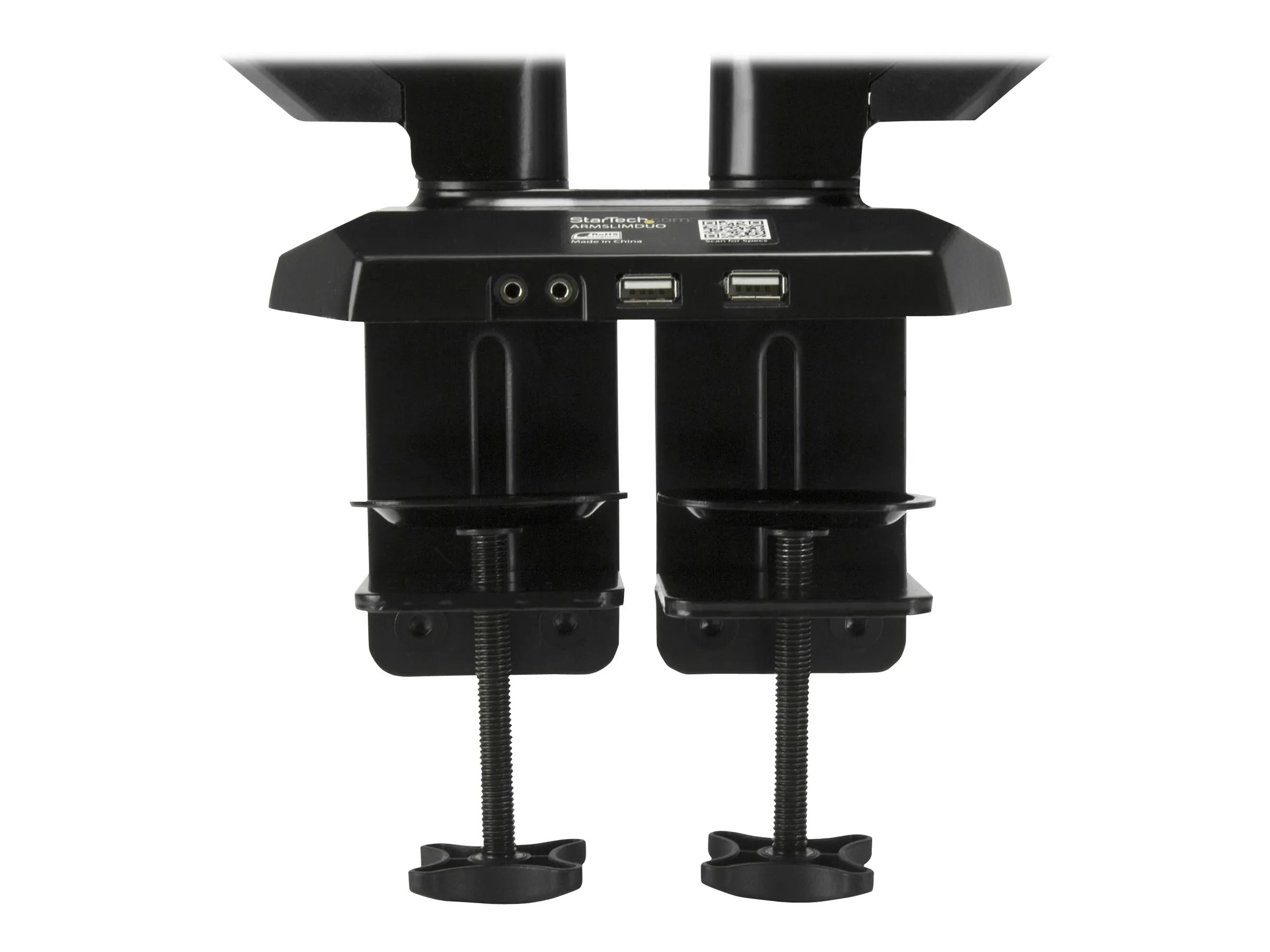 Améliorez votre productivité et libérez un espace précieux grâce au support ARMSLIMDUO pour deux écrans. Ses deux bras autonomes favorisent le réglage des deux écrans, et l'accès aux ports est facile grâce aux deux ports USB passthrough et aux prises pour casque d'écoute.