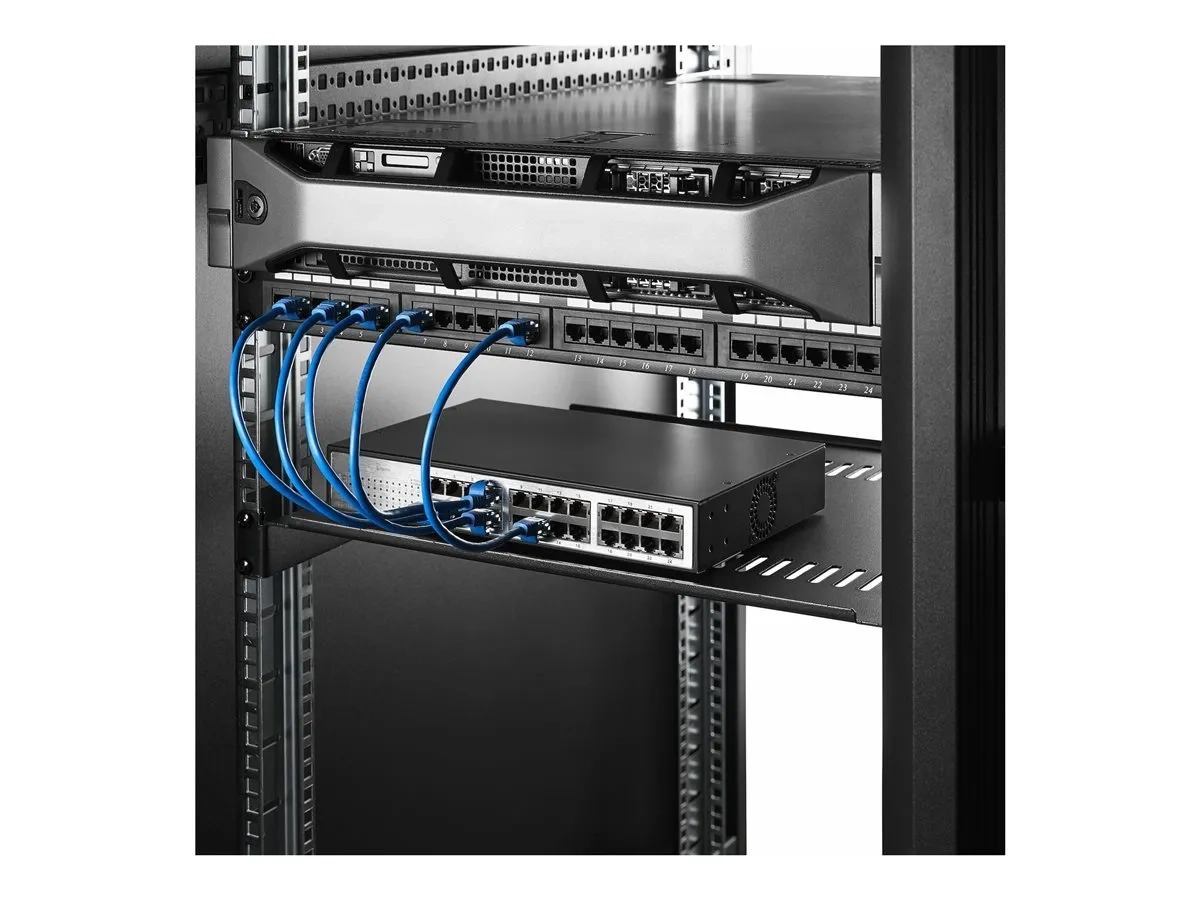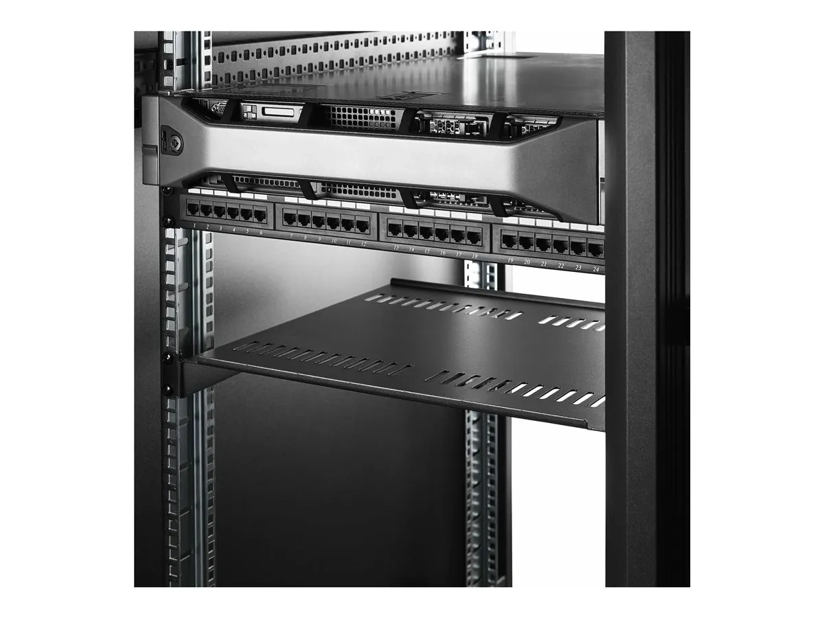 Cette étagère de rack serveur en acier SPCC de calibre 16 offre une capacité de charge maximale de 44 lb (20 kg).
