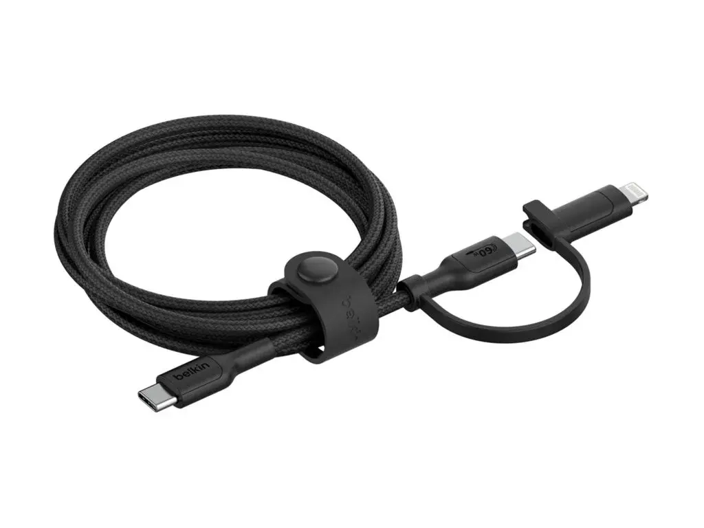 Le câble BoostCharge Pro 2-en-1 de Belkin offre une solution de charge polyvalente, ce qui en fait un accessoire essentiel pour vos appareils. Avec un connecteur USB-C à une extrémité et à la fois Apple Lightning et USB-C à l'autre, ce câble est conçu pour répondre à une variété de besoins de charge. Il prend en charge la charge rapide jusqu'à 60 W et transfère les données à des vitesses allant jusqu'à 480 Mbps, ce qui garantit l'efficacité de la mise sous tension et de la synchronisation des appareils.