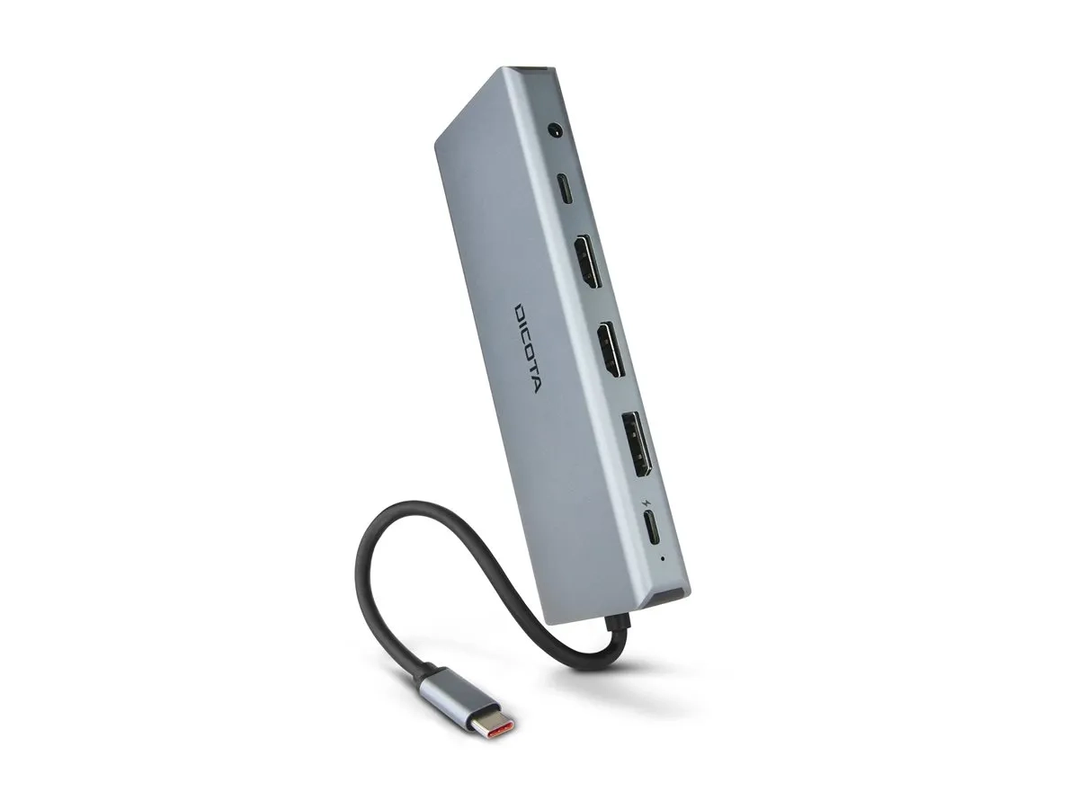 La station d'accueil DICOTA transforme votre espace de travail en une zone efficace et polyvalente, adaptée à tout cadre professionnel. Avec son câble USB-C intégré, elle offre une solution Plug-and-Play simple, éliminant les tracas liés à la multiplicité des câbles et des connecteurs. Cet appareil n'est pas qu'une question de connectivité, il s'agit d'optimiser votre productivité. Avec deux ports HDMI, un DisplayPort et la prise en charge de 3 écrans externes, il permet une expérience visuelle complète, parfaite pour le multitâche et les projets détaillés. L'intégration de lecteurs de cartes SD et microSD renforce encore son utilité, en facilitant l'accès à un large éventail de formats multimédias. Pour les professionnels qui exigent un transfert de données à grande vitesse, les ports SuperSpeed USB 3.0 et USB-C avec Power Delivery (100 W) garantissent que les appareils sont connectés et chargés efficacement. Le boîtier en aluminium épuré ajoute non seulement une touche d'élégance à votre espace de travail, mais garantit également sa durabilité. Que vous soyez dans un environnement de travail rapide ou que vous ayez besoin d'une installation de bureau à domicile fiable, la station d'accueil DICOTA est conçue pour répondre aux exigences des professionnels modernes.