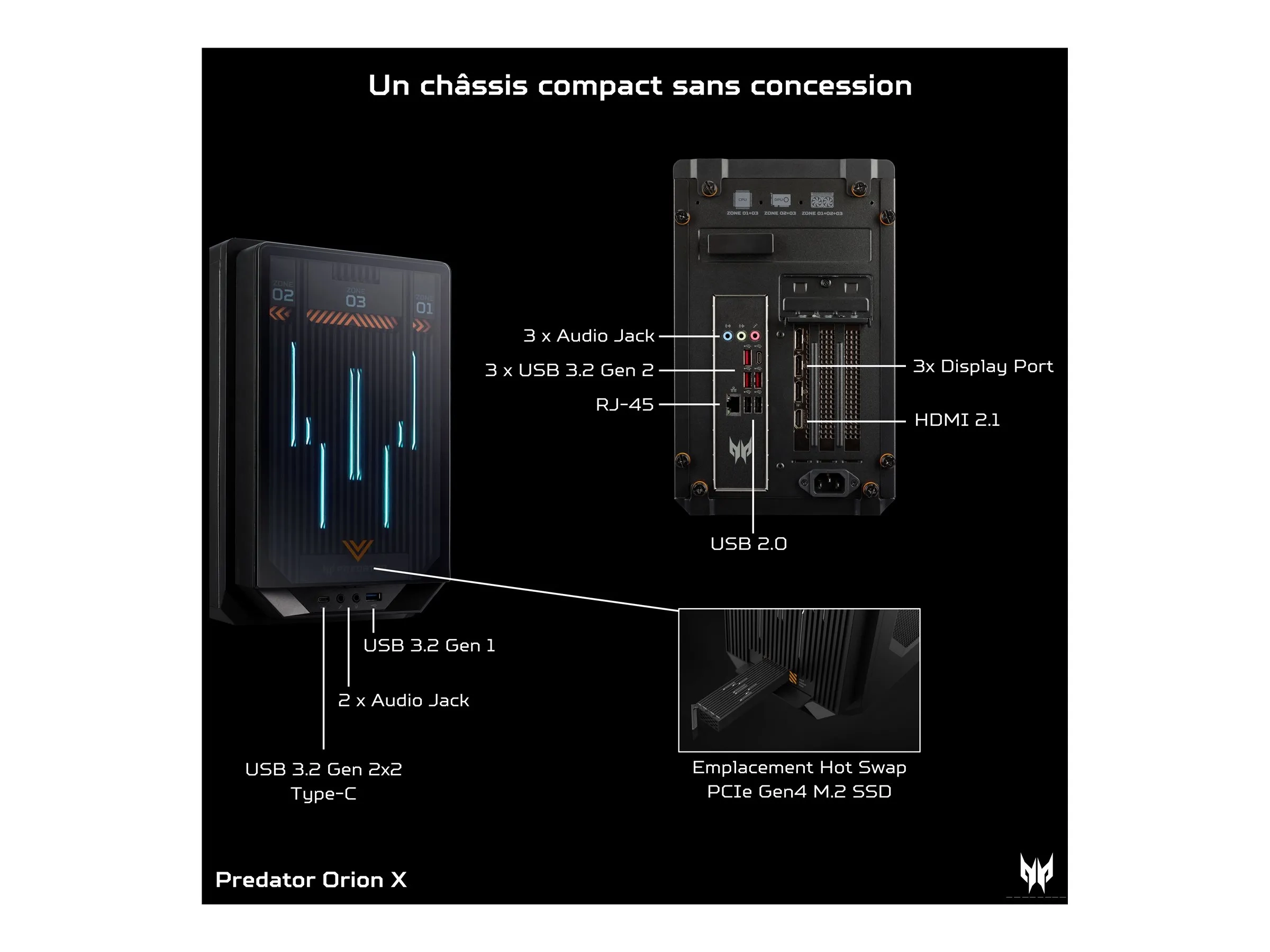 Acer Predator Orion X POX-950 - Châssis compact jeux - Core i9 13900KF / jusqu'à 5.8 GHz - RAM 32 Go - SSD 1.024 To - NVIDIA GeForce RTX 4090 - IEEE 802.11ax (Wi-Fi 6E), Bluetooth 5.3, Gigabit Ethernet, 2.5 Gigabit Ethernet - Win 11 Home - moniteur : aucun