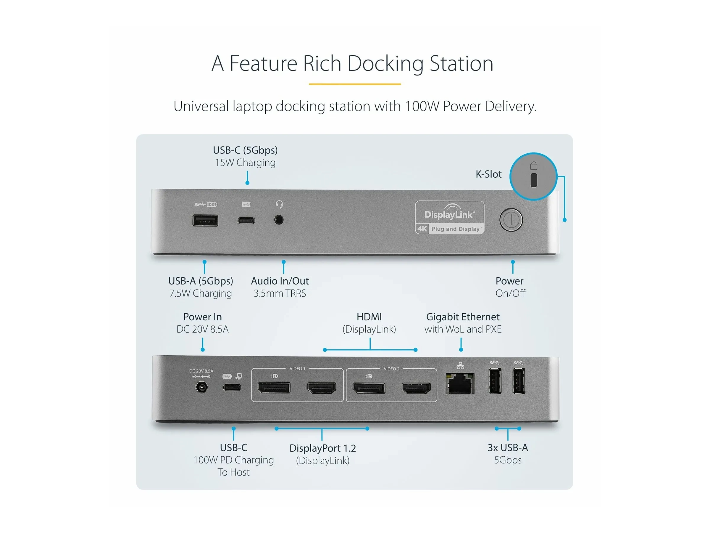 | Caractéristiques | Fente de verrouillage de sécurité (câble de verrouillage vendu séparément), prise en charge de moniteur multiple, prise en charge de Preboot Execution Environment (PXE), support full duplex, DisplayPort Alt Mode, puissance délivrée de 100 W |