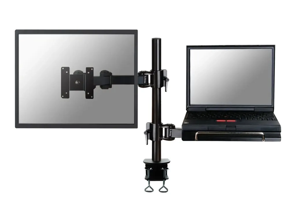 Le support de bureau Neomounts, modèle FPMA-D960NOTEBOOK est un support de bureau avec inclinaison, rotation et pivot pour écrans plats jusqu'à 27" (69 cm) et notebooks jusqu'à 22". Ce support est un excellent choix pour économiser de l'espace sur le bureau en utilisant une pince.