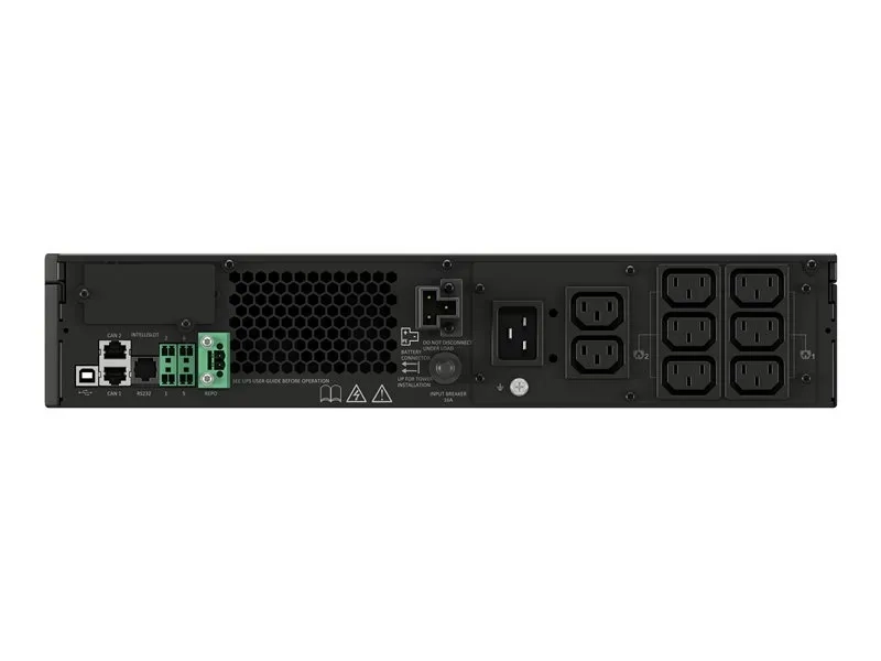Fonctions Batterie remplaçable à chaud, batterie interchangeable, Écran LCD, protection contre les surintensités, protection contre les surtensions, protection contre les sous-tensions, Remote Emergency Power Off (REPO), large plage de tension d'entrée, 2 x groupes de prises contrôlables