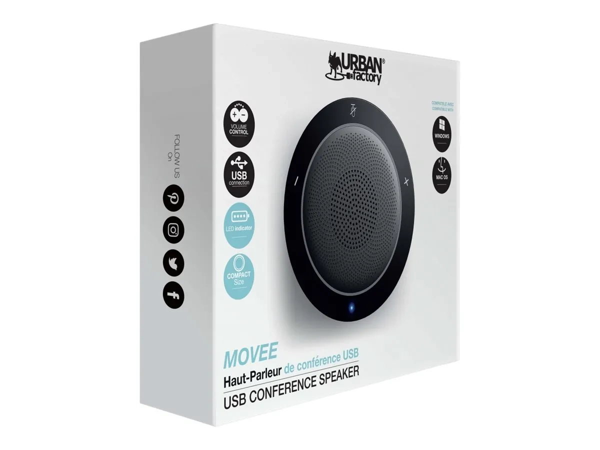 Les microphones intégrés à 360° captent tous les sons tandis que sa technologie de traitement numérique intégrée fournit un son clair sans écho et sans distorsion. Le haut-parleur Movee capte les voix dans un rayon de 4 à 5 mètres, ce qui en fait un accessoire indispensable pour des conférences de groupe.