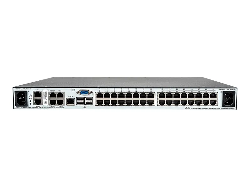 | Interfaces | 32 x KVM RJ-45 ¦ 1 x VGA HD-15 ¦ 2 x 1000Base-T RJ-45 ¦ 5 x USB 2.0 Type A ¦ 4 x série (RS-232) RJ-45 |