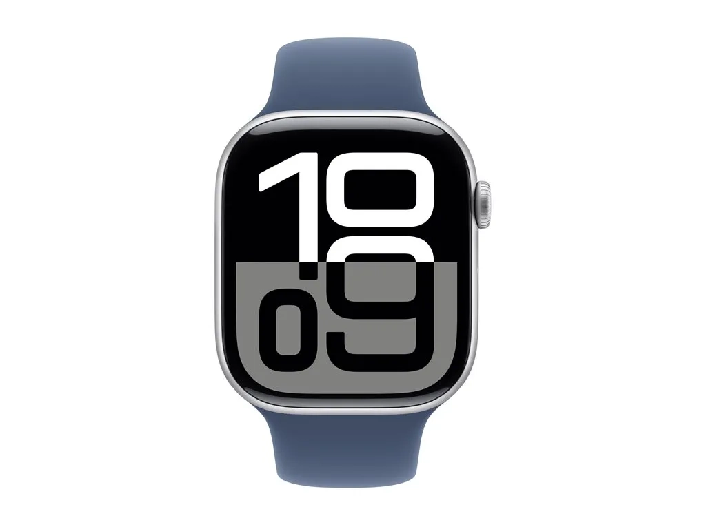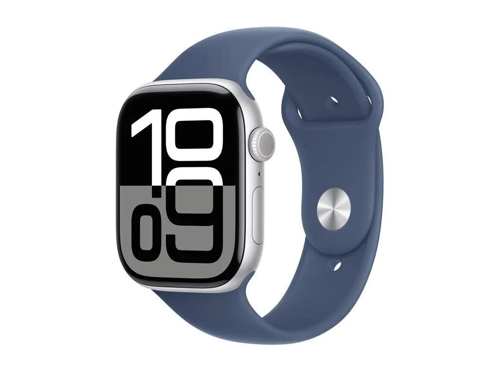 Apple Watch Series 10 (GPS) - 46 mm - aluminium argenté - montre intelligente avec bande sport - fluoroélastomère - denim - taille du bracelet : S/M - 64 Go - Wi-Fi 4, Bluetooth, UWB - 36.4 g