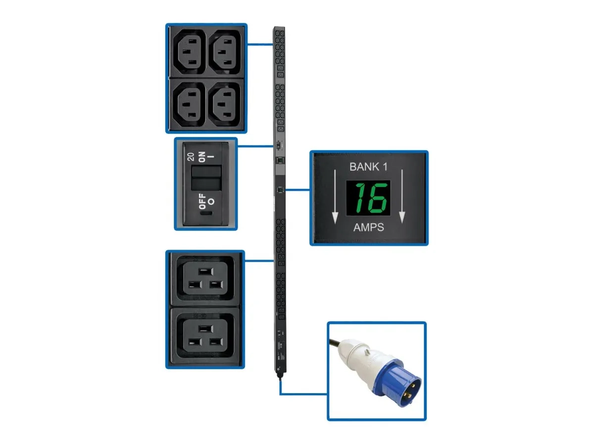 Tripp Lite PDU Metered Vertical 7.4W 230V 8 C19 40 C13 IEC 309 32A 0U TAA - Unité de distribution secteur (rack-montable) - 32 A - CA 230 V - 7.4 kW - entrée : IEC 60309 32A - connecteurs de sortie : 48 (power IEC 60320 C13, IEC 60320 C19) - 0U - 3.05 m cordon - Conformité TAA