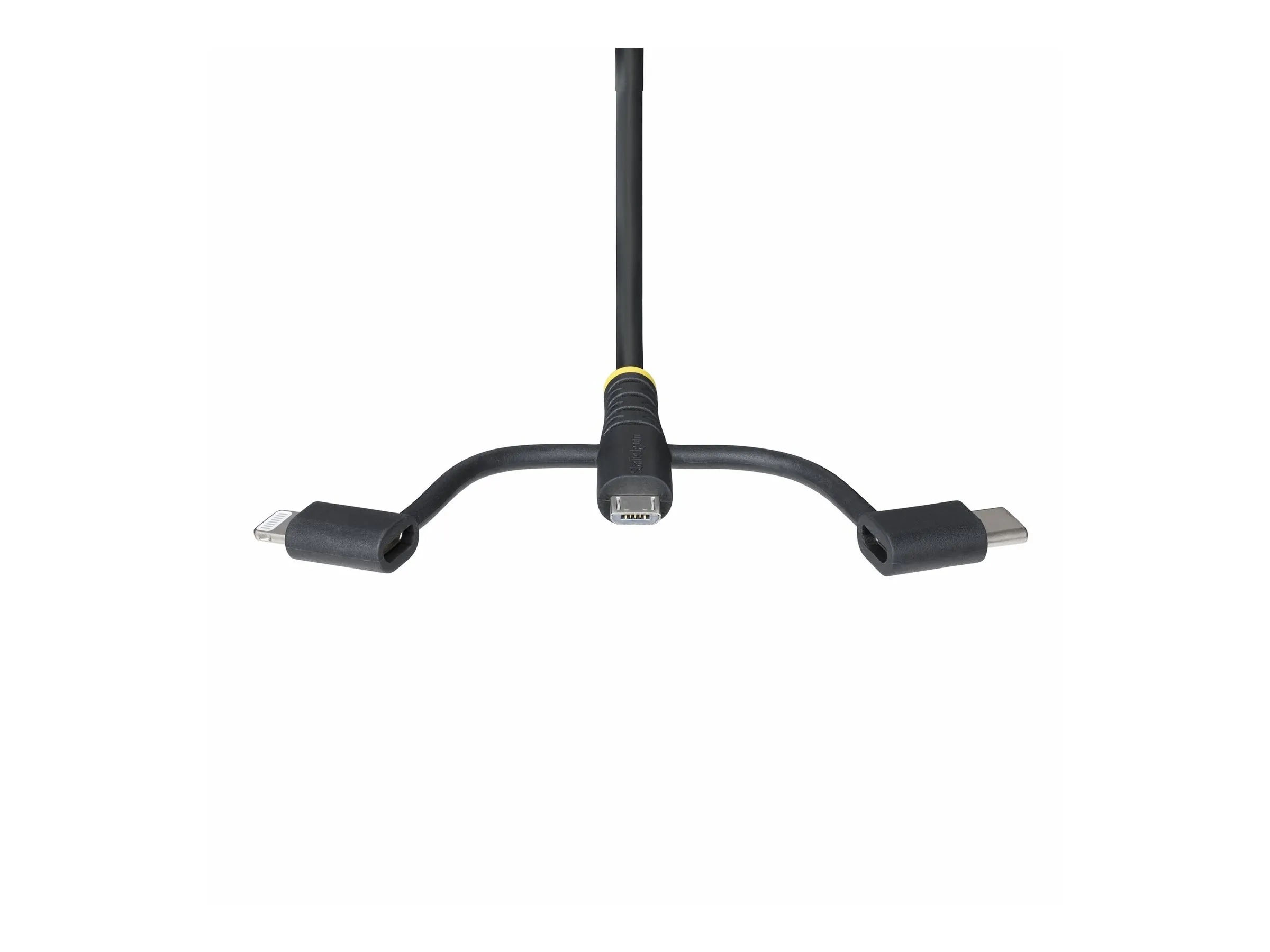 Pour charger ou synchroniser un appareil mobile USB-C ou Lightning, il suffit d'attacher le connecteur correspondant au connecteur Micro-USB et de le brancher à votre appareil. Pour charger ou synchroniser un appareil Micro-USB, branchez simplement le connecteur central du câble à votre appareil mobile.