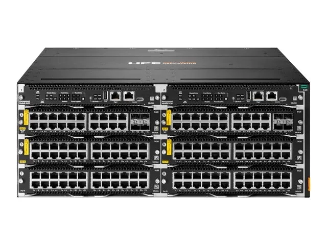 La gamme de commutateurs HPE Aruba Networking CX 5420 est un châssis de commutateur de couche 3 intelligent, flexible et modulaire conçu pour répondre aux besoins des réseaux d'entreprise actuels, tels que les campus d'entreprise de petite et moyenne taille et les réseaux d'entreprise de succursales. Il intègre une capacité matérielle MACsec, des fonctions d'analyse et d'automatisation. Le châssis du commutateur CX 5420 fait partie de la gamme de commutateurs CX qui offre une solution de couche d'accès professionelle facile à déployer, simple, sécurisée et résiliente. En combinant un système d'exploitation moderne entièrement programmable avec le moteur d'analyse réseau HPE Aruba Networking (NAE), le commutateur CX 5420 offre des fonctionnalités de surveillance et de dépannage de pointe dans l'ensemble du réseau. Une architecture puissante Gen7 ASIC fournit d'excellentes performances et une prise en charge étendue des fonctionnalités ainsi qu'une programmabilité flexible pour les applications de demain. Ce commutateur de châssis modulaire avancé 4U offre une capacité allant jusqu'à 960 Gbit/s avec une faible latence, 6 logements de cartes en ligne en demi-largeur, VSX Live Upgrade, et HPE Smart Rate PoE Classe 8 10GbE jusqu'à 90W avec prise en charge BGP/OSFP/PIM.