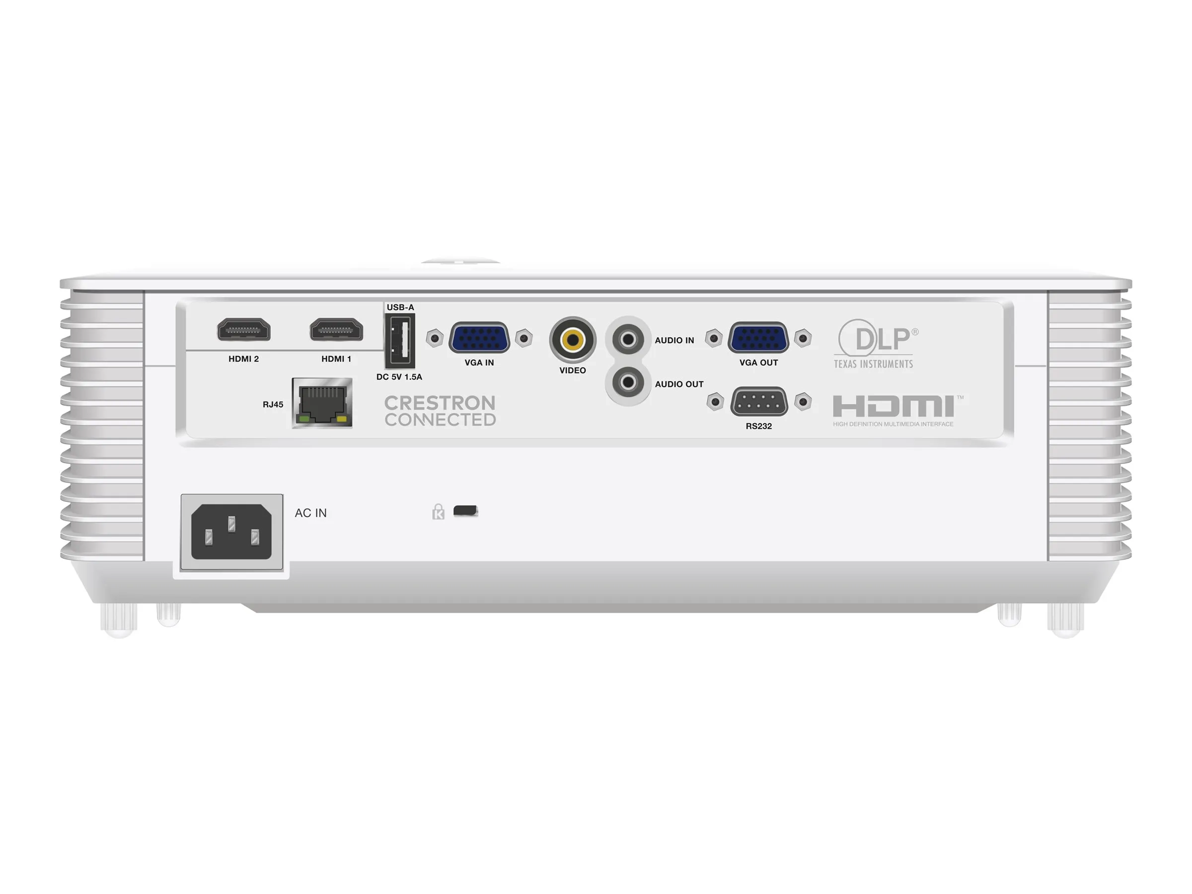 | Interfaces | 1 x entrée VGA - 15 broches HD D-Sub (HD-15) ¦ 1 x entrée vidéo composite ¦ 2 x entrée HDMI - HDMI de 19 broches de type A ¦ 1 x entrée de ligne audio - mini-phone stereo 3.5 mm ¦ 1 x USB (service) - USB de type A 4 broches ¦ 1 x sortie de ligne audio - mini-phone stereo 3.5 mm ¦ 1 x sortie VGA - 15 broches HD D-Sub (HD-15) ¦ 1 x série RS-232 - D-Sub (DB-9) 9 broches ¦ 1 x USB (alimentation uniquement) - USB de type A 4 broches ¦ 1 x réseau - RJ-45 |