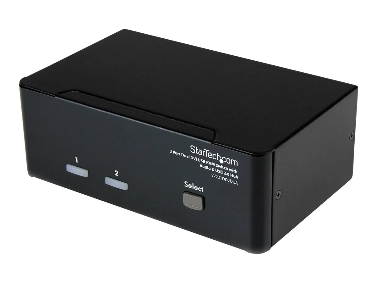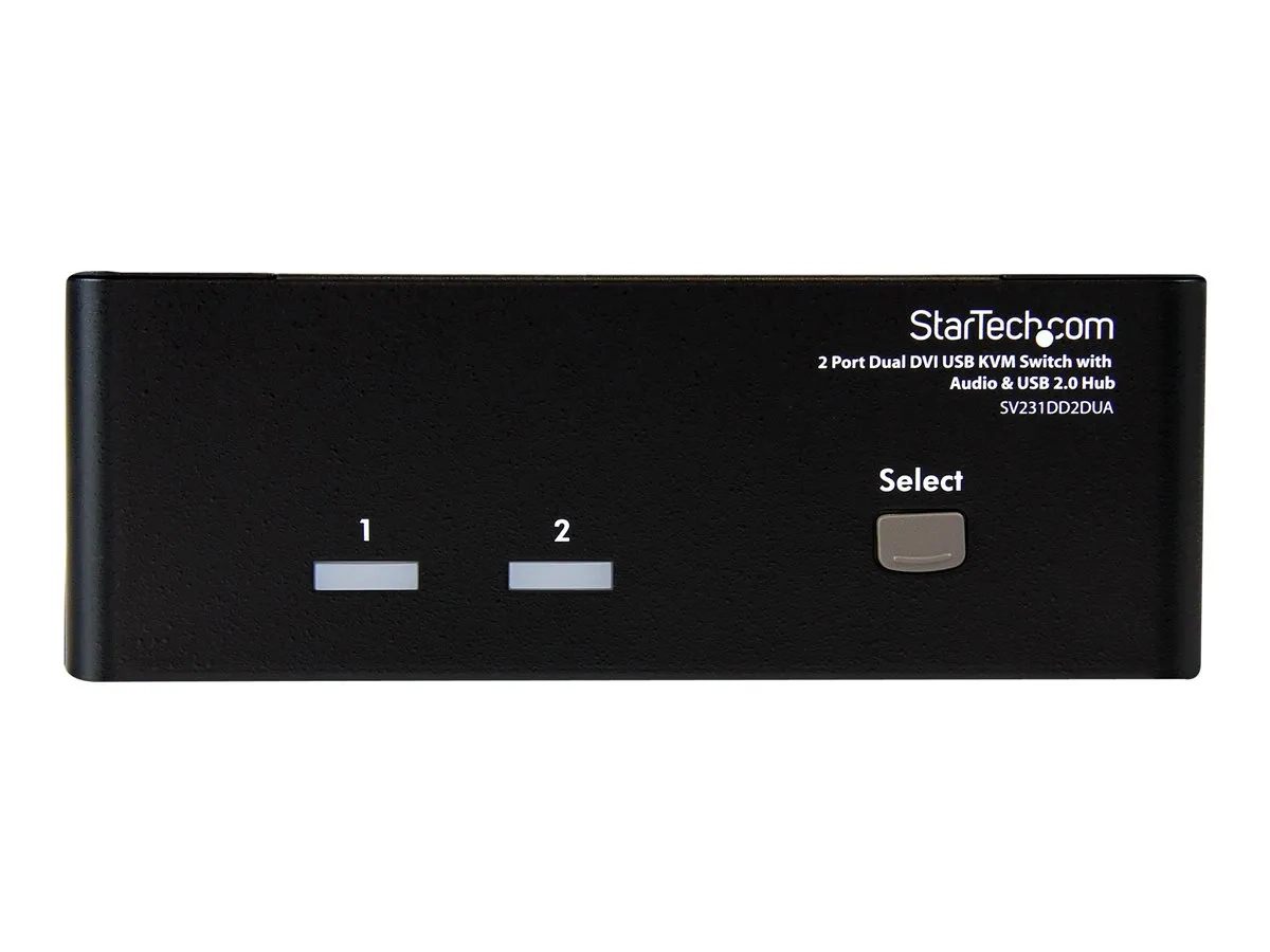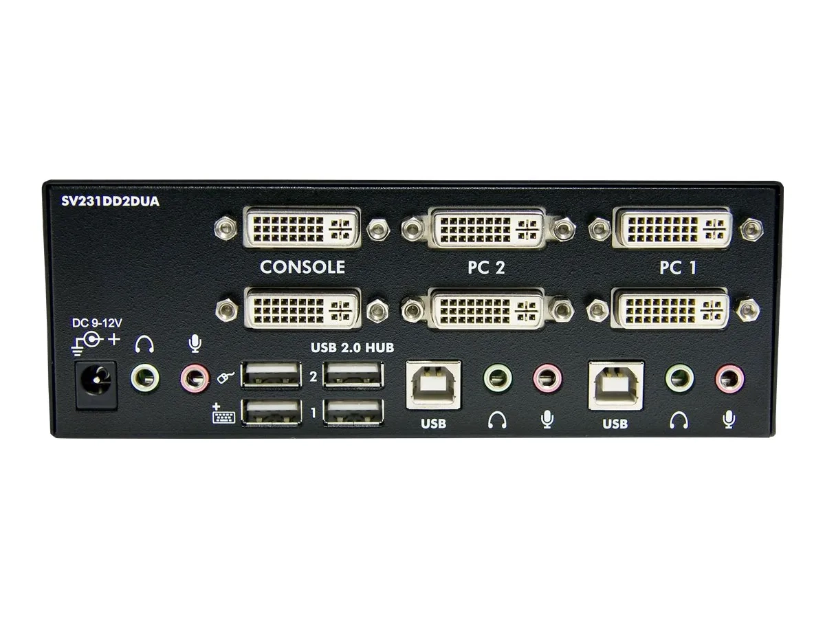 Le commutateur KVM USB Dual DVI 2 ports, référence SV231DD2DUA, permet le partage entre deux PC dotés de deux sorties vidéo DVI, de deux écrans, un microphone et un ensemble de haut-parleurs, un clavier et une souris ainsi que deux autres périphériques USB.