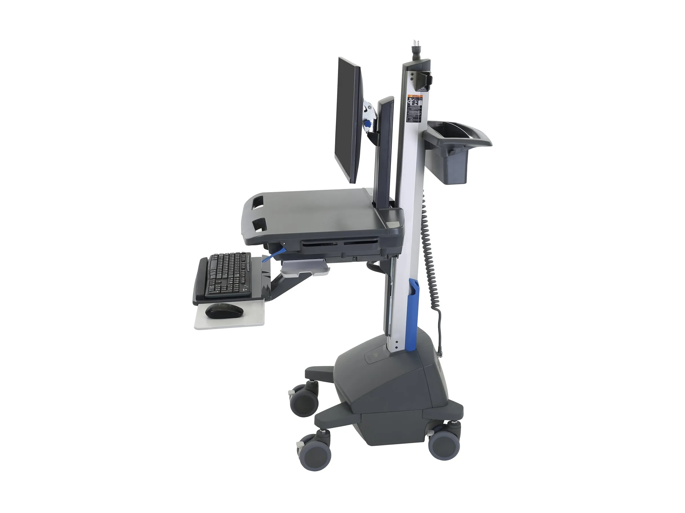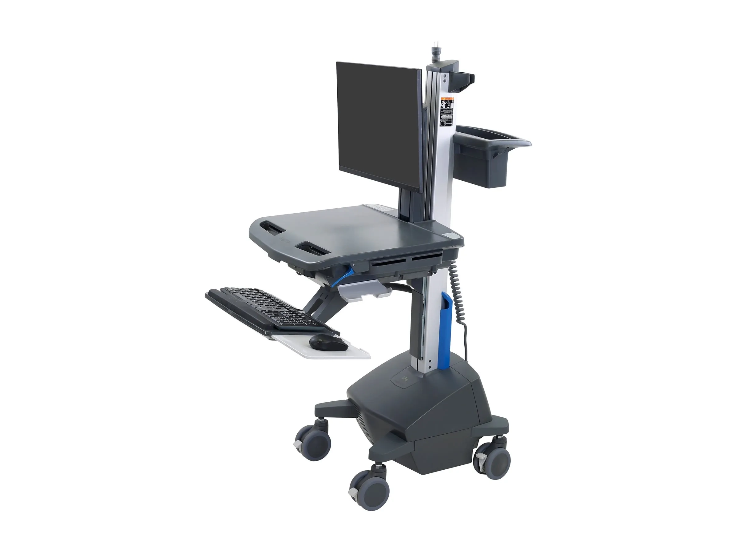 Les fonctions intégrées, telles qu'un hub USB à 4 broches, un indicateur d'état de charge LED et un plateau pour clavier avec repose-poignets, améliorent non seulement la productivité, mais garantissent également que tout ce dont vous avez besoin se trouve à portée de main. Construit à partir de matériaux durables tels que l'aluminium, le plastique de haute qualité et l'acier zingué, et équipé de freins verrouillables, il assure à la fois la stabilité et la sécurité de votre équipement.