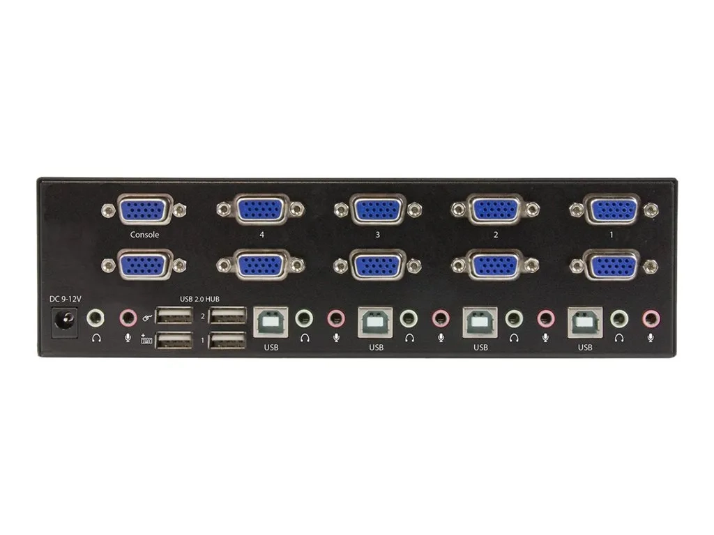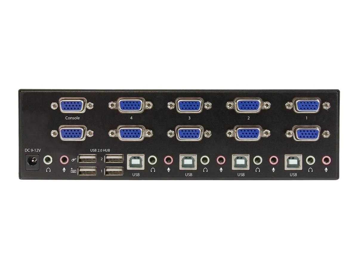 Ce commutateur KVM USB vous permet de brancher quatre ordinateurs comportant chacun deux sorties VGA à un poste de travail à deux écrans. Vous pouvez basculer la station de travail entre les ordinateurs, ainsi que deux autres périphériques USB, des haut-parleurs 3,5 mm et un microphone.