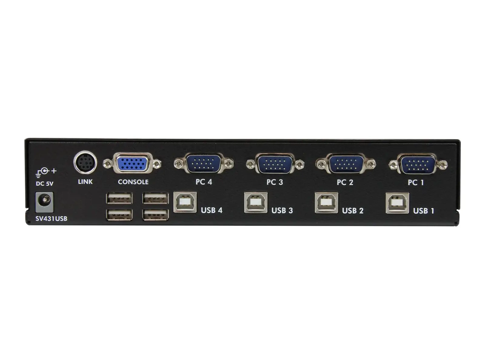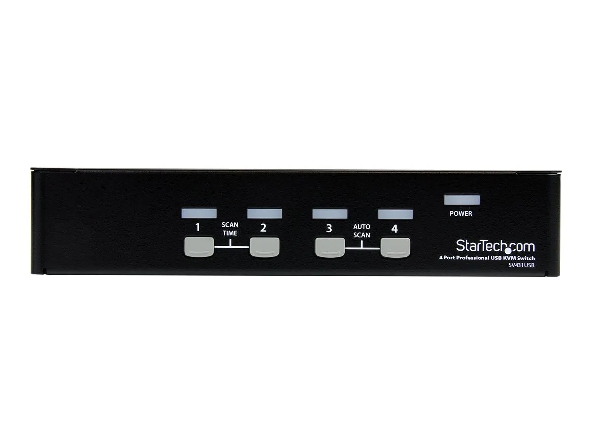 Le commutateur KVM USB VGA monté en rack à 4 ports avec hub, SV431USB, permet un contrôle simple d'au plus quatre ordinateurs à partir d'un seul moniteur/écran et ensemble de périphériques USB (clavier et souris).
