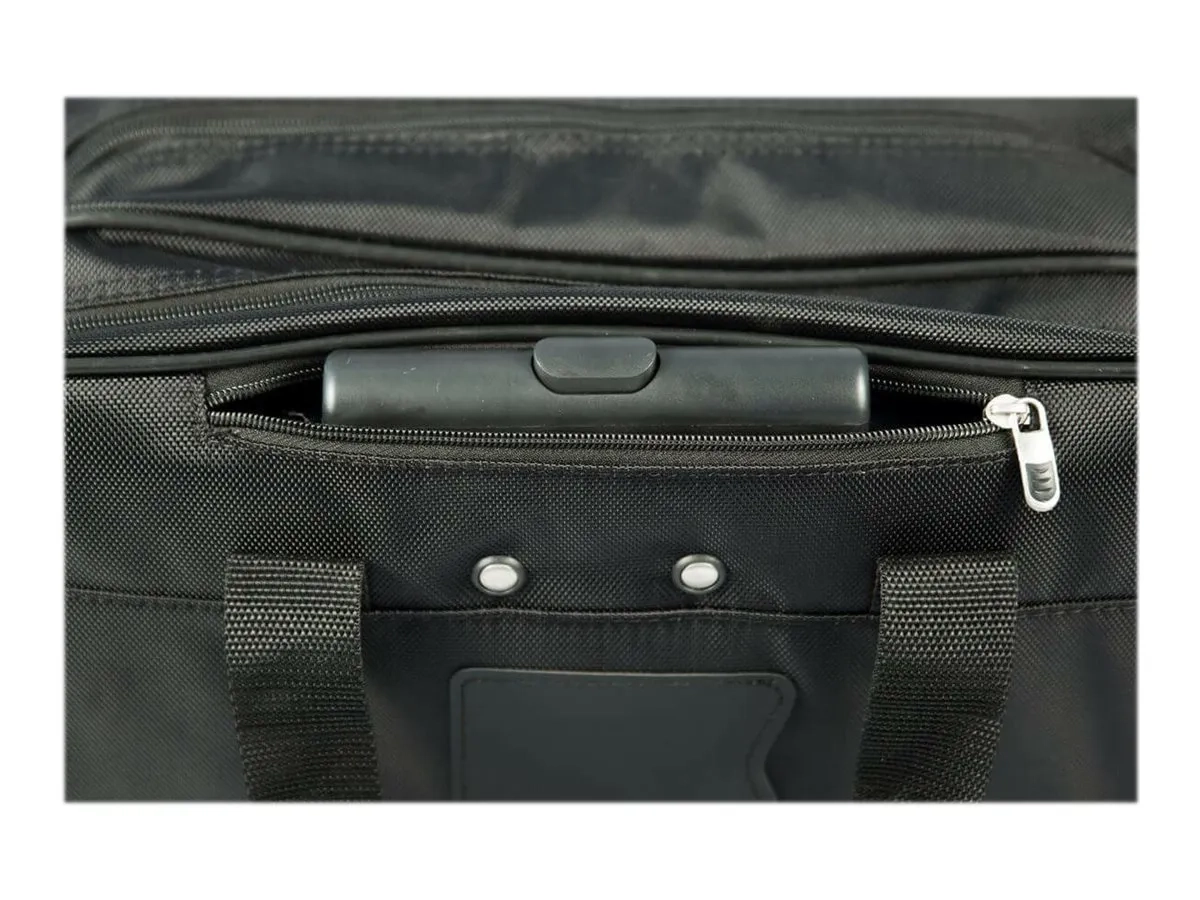 La mallette Targus Rolling Laptop Case a ete concue pour recevoir des ordinateurs portables equipes d'un ecran allant jusqu'a 16". Le rembourrage en mousse a cellules fermees protege votre ordinateur portable et le materiau en polyester 1200D durable et resistant a l'eau maintient vos affaires au sec dans les intemperies. Le poste de travail avant a fermeture eclair descendante comprend des porte-stylos, un porte-cartes de visite, une poche zippee, une pochette pour telephone portable et une grande poche pour ranger les autres accessoires. La mallette Rolling Laptop offre egalement un grand compartiment zippe pour ranger vos fournitures ou vos vetements pour les deplacements de courte de duree. La poignee telescopique se retracte dans le compartiment zippe quand elle n'est pas utilisee et la mallette est dotee d'une double poignee de transport pour plus de commodite. La Rolling Laptop Case est une mallette de voyage fonctionnelle concue pour les professionnels en deplacement.