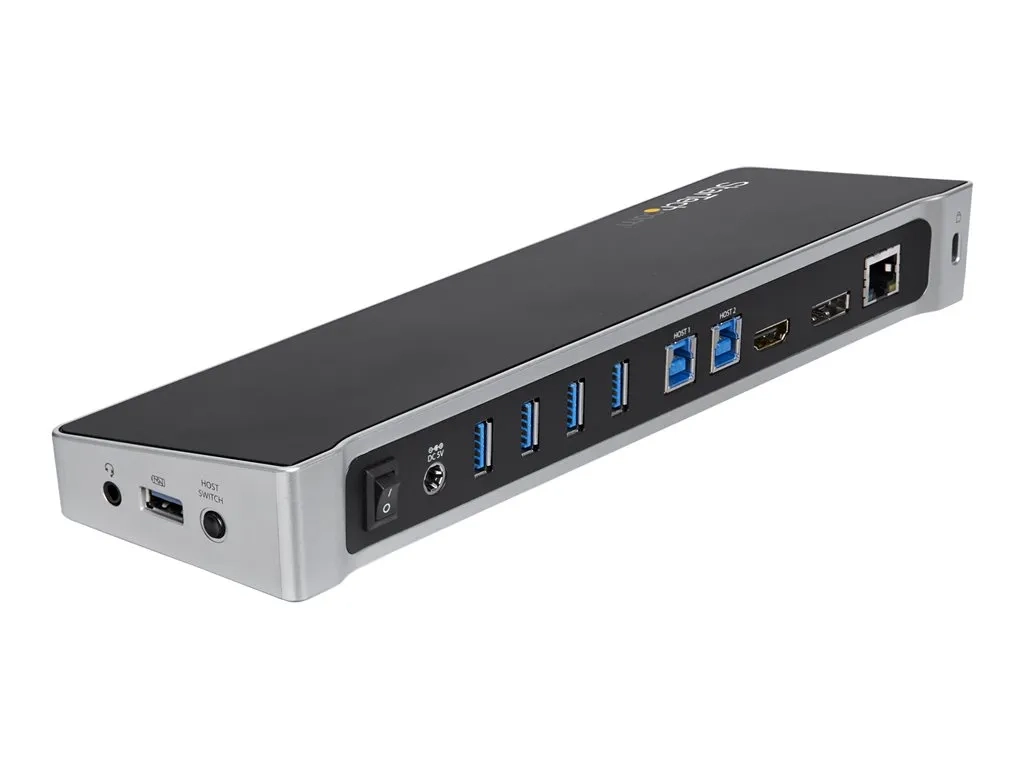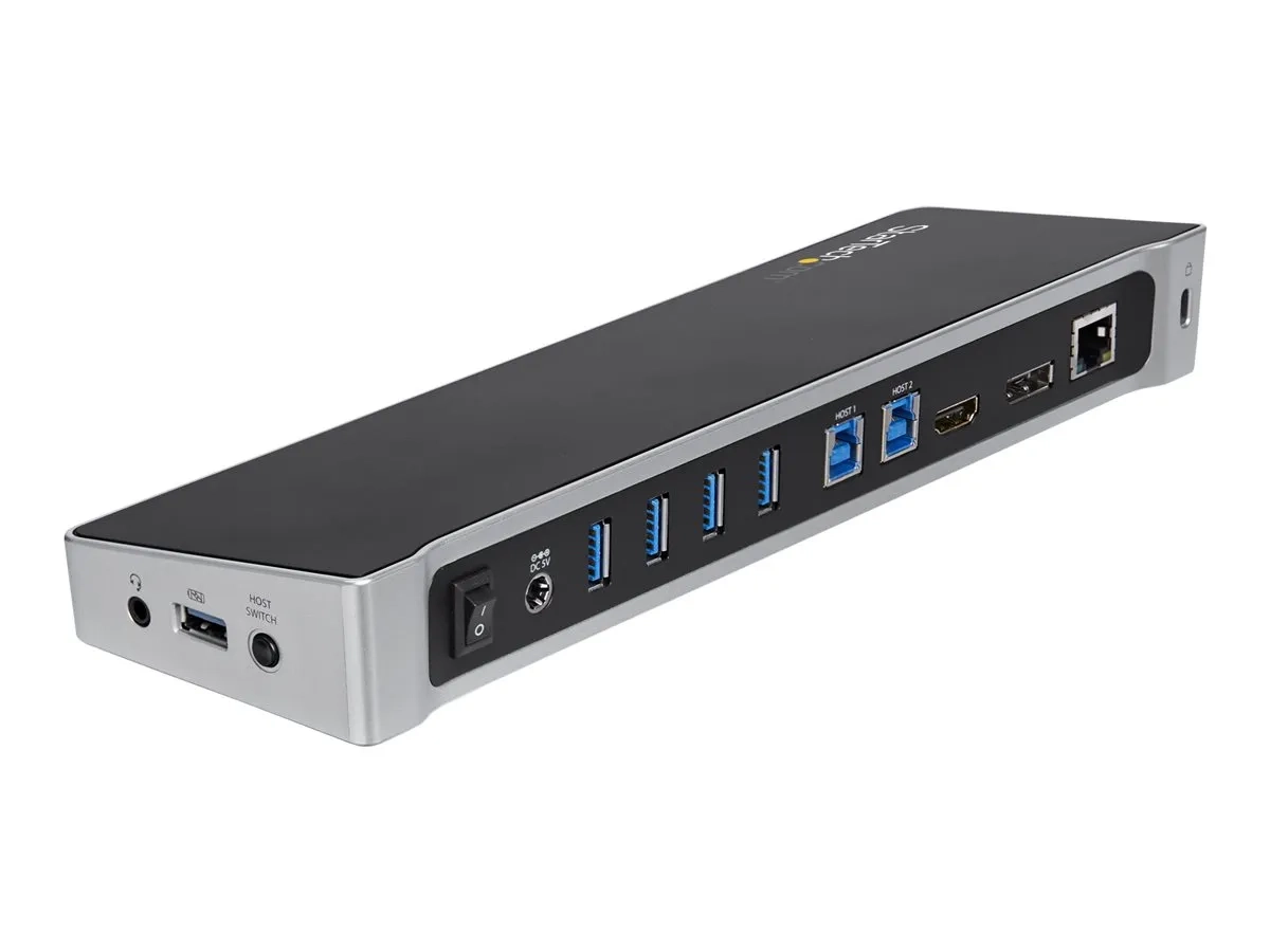 Cette station d'accueil USB 3.0 KVM, conforme aux exigences TAA, fonctionne comme un commutateur KVM pour deux ordinateurs portables. Elle vous permet de partager votre clavier, votre écran et votre souris, ainsi que transférer des fichiers entre vos deux ordinateurs portables connectés.
